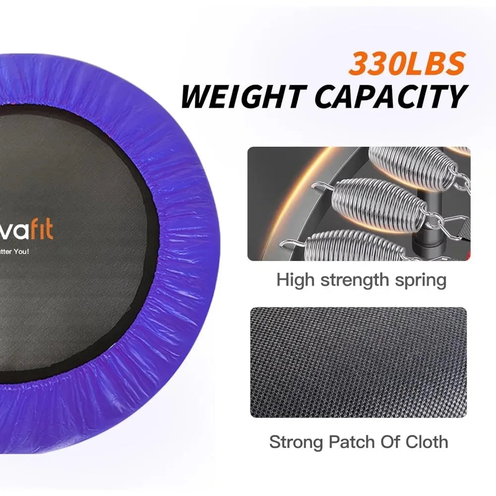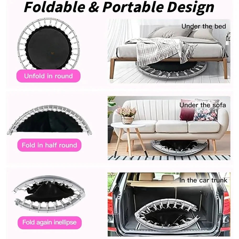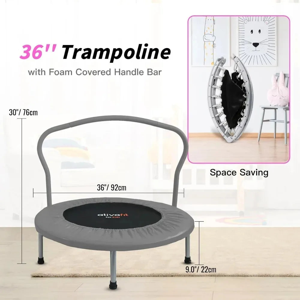 EASY INSTALLATION AND STORAGE: From box to fully assembled is in less than 10 minutes, can be folded for convenient storage or outdoor use, takes up no space. SAFE DESIGN: trampoline comes with a handle which is helpful to prevent your kids from falling off the trampoline mat, is safty for children to use. And with the high elasticity springs, protecting kids from hurt caused by falling onto springs. MULTIFUNCTIONEN: Helping to increase bone density as well as muscle control and coordination, which helps kids grow taller, improve circulation and reducing children's likelihood of obesity, make the relation between parents and children more closer. FOLDABLE AND SPACE SAVER: Easy folding and designed to fit small spaces in the gym or at home. Its convenient size lets you carry it from one spot to another without any hassle Good Quality: Made of heavy-duty frame, PP jumping mat, PVC safe pad cover, stainless steel springs, rubber-tipped leg tube and foam covered handle